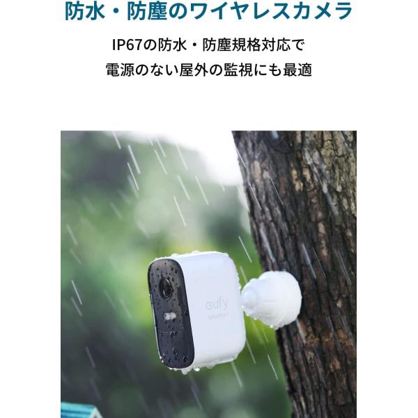 ・自宅周辺の監視に最適:撮影用のeufyCam 2Cと撮影データを保管するHomeBase 2のセットで、ワイヤレス接続が可能。カメラは1回の満充電で約180日間の長期間使用が可能な他、IP67の防水・防塵規格対応で、電源のない屋外の監視にも最適です。