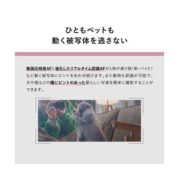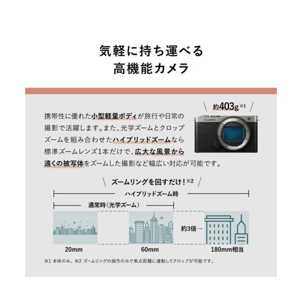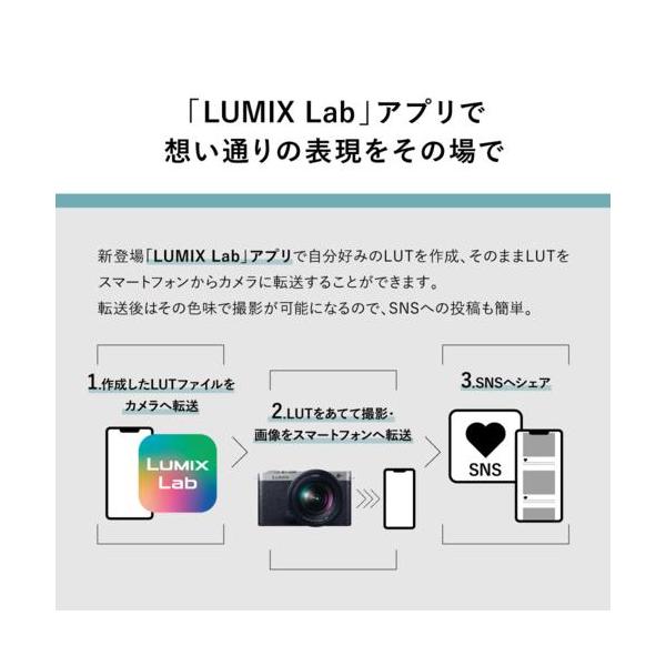 ■小型軽量ボディが実現する機動力と高い描写性能 約403gの携帯性に優れた、小型・軽量ボディが日常や旅先での撮影で活躍 約24.2M フルサイズCMOSセンサーと新世代ヴィーナスエンジンが可能にする高い描写性能 「像面位相差AF」の採用により、より高精度なAF追従性能を実現する進化したリアルタイム認識AF 動画周辺歪み補正と強モードを新たに搭載。歩き撮り時での大きなブレや周辺の歪みを大幅に軽減する進化した「アクティブ I.S.」■新開発「LUMIX Lab」アプリでスマートフォンと快適連携 カメラからスマートフォンへ写真・動画を高速転送、色編集が可能 自分好みの色表現が楽しめるオリジナルのLUTファイルをアプリで簡単に作成・カメラへ転送、撮影を楽しめる 広い画角から写真感覚でトリミング編集ができ、スマートフォンへの共有をよりスムーズにできる 動画形式MP4(Lite)を搭載 ■写真・動画の表現の幅を広げる進化したリアルタイムLUT LUTファイルのベースフォトスタイル自動判別・設定機